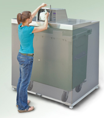 Die Klappe wird geschlossen und die Wertstoffe fallen in einen Normcontainer von 770 l, der zum Beispiel bei jeder Bioabfall-Tour entleert wird.